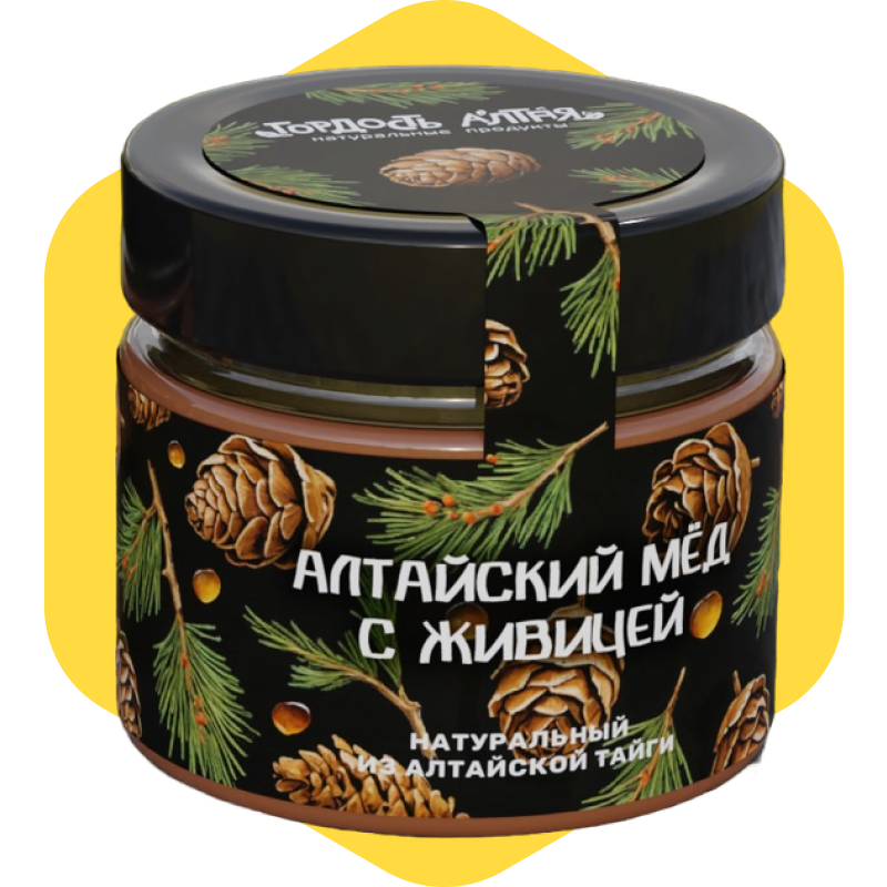 Живица (кедровая смола) — мощный природный антисептик, источник фитонцидов, терпеноидов и биологически активных веществ. В сочетании с алтайским мёдом и кедровым маслом она усиливает оздоравливающее действие продукта. Такой мёд может использоваться не только как десерт, но и как функциональная добавка — для иммунной поддержки, при простудах, в программах общего восстановления организма.