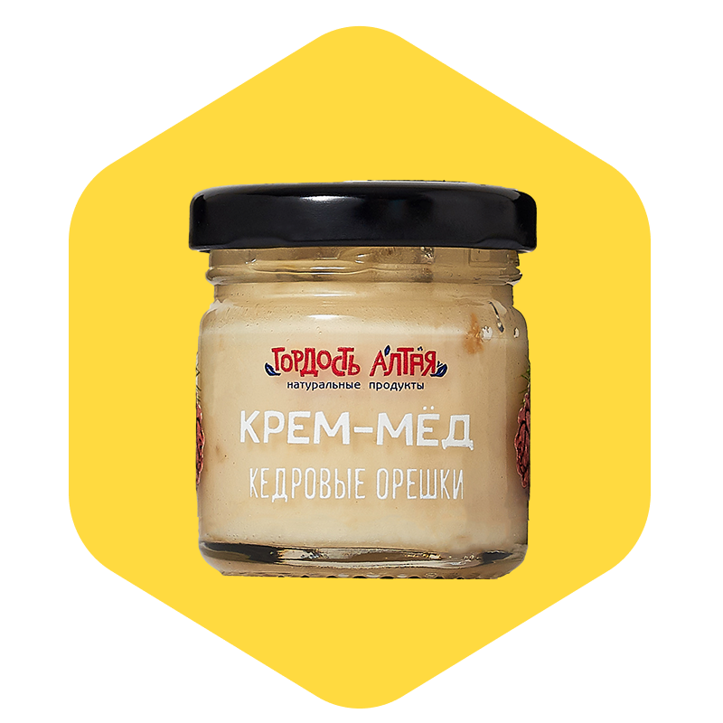 Крем-мёд с кедровыми орешками — это натуральный десерт на основе цветочного алтайского мёда, взбитого до мягкой кремовой текстуры, с добавлением цельных отборных кедровых орехов. Орехи равномерно распределены по всей массе и придают продукту хрустящую структуру и насыщенный вкус.